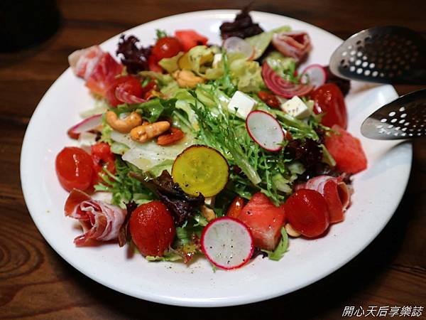 富含綜合生菜、菲達起士、索蘭諾火腿、季節性水果-西瓜、蜜漬小蕃茄、多種堅果加上特調醬汁-雪莉酒油醋