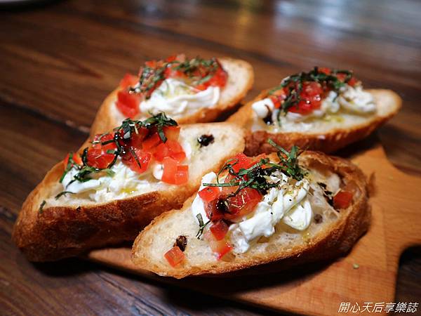 炙烤麵包上有著蕃茄丁、九層塔、羅勒葉、起司堆疊成的沙拉,再淋上巴薩米克醋、橄欖油