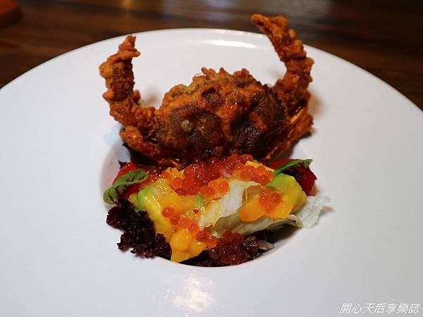 整隻現炸的軟殼蟹,口感香酥帶Q,很好咀嚼