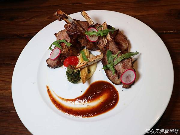羊排先煎後烤,富含薯泥、筊白筍、玉米筍、花椰菜、芝麻葉、油漬番茄、櫻桃蘿蔔