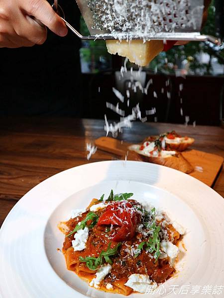 端上桌後,服務人員立馬桌邊現刨帕達諾起司,灑落水管麵上,看起來好可口!