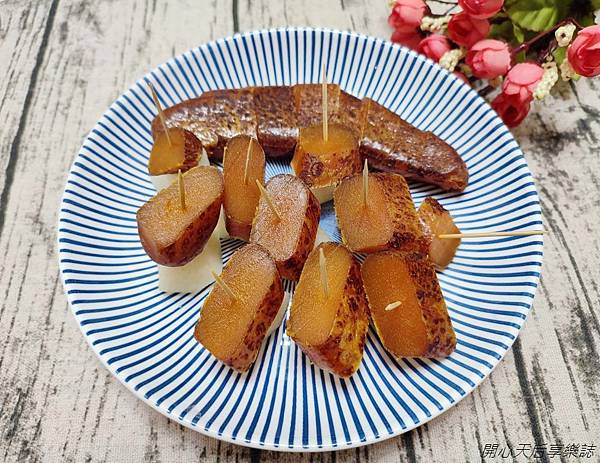 我把部份厚切的烏魚子串上水梨,更增添香甜,讓恩恩好愛吃喔!