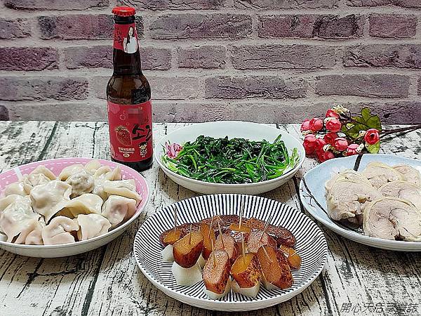 一盤陳家烏魚子,再搭配醉雞腿肉、水餃、青菜、草莓燒酒,很可以是一個人的年夜飯,吃完會感到好滿足!