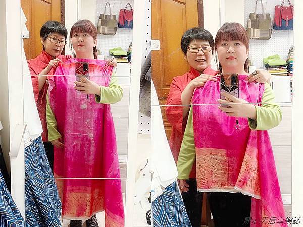 面對眾多繽紛的布料,我很有選擇障礙,挑了桃紅色的設計師布,讓老師幫我披在身上,介紹它的奇妙~做成上衣或洋裝都可以展現它最美的設計之處