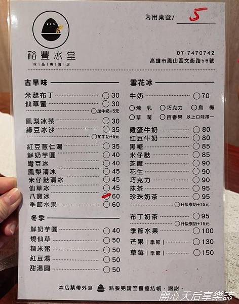 『裕豐冰堂』菜單,冰品種類不少,價錢比台北便宜