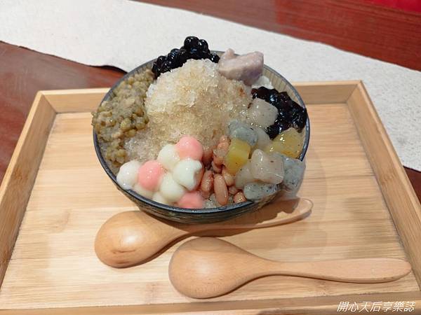 餐具很古色古香,8種配料,都有一定的水準,湯圓、芋圓、粉圓吃起來軟Q,芋頭鬆軟綿密,整體口味微甜,吃了不膩口!