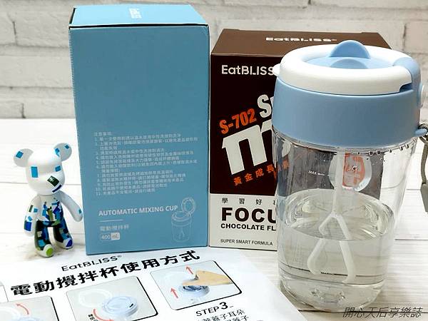『Eatbliss益比喜 S702黃金成長素系列』隨身包,好攜帶,沖泡方便,恩恩會帶出門自己沖泡來喝,而且他很愛玩電動攪拌杯呢,每次沖泡時都好開心~
