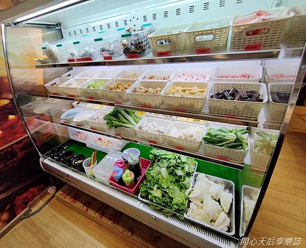 自助吧,琳琅滿目,含有多種新鮮蔬食、多種特色火鍋料、麵條、豆皮、油條、醬料等