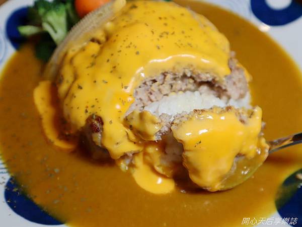 我一口吃進多層次美味~起司濃厚奶香、漢堡排鹹香肉味、咖哩濃郁香甜,吃完好滿意!