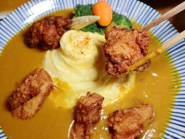 唐揚雞呈現焦糖美色,而且不小塊,外皮香酥,雞肉彈嫩多汁,單吃就很好吃,沾點咖哩醬汁吃,更是香甜好滋味!
