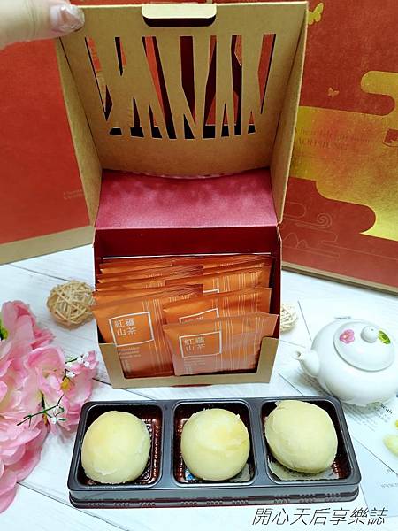 『嬤嬤覓呀 金典禮盒』含有手工珍珠餅6入(干貝餡) + 覓香・紅蘊山茶2盒(12包入/1盒) NT1,310