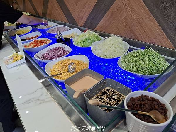 我先逛一圈,不同的自助餐枱上有著台式/西式/中式料理~熱炒、滷味、炸物、冷盤、生菜沙拉、多樣化的水果區/飲料/甜點/烤土司/冰淇淋吧,選擇超多,還不停的補上新菜色,讓我們很有選擇障礙也來不及吃啊~因為每一樣都想吃!