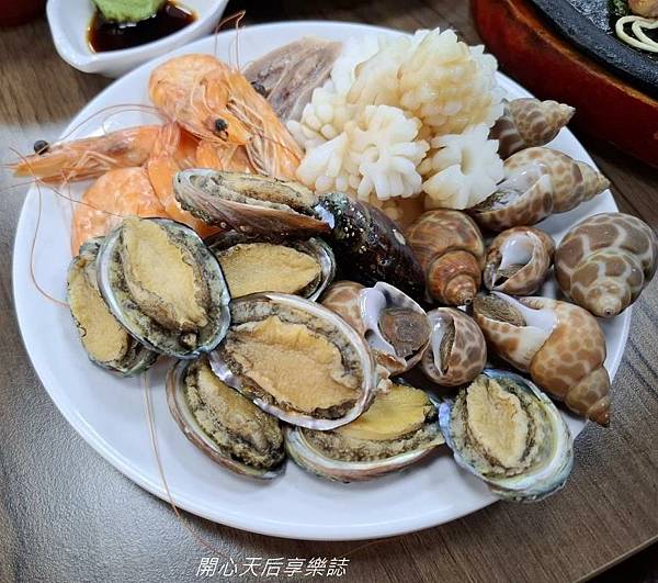 海鮮有淡菜、花枝、甜蝦等,新鮮不腥,備有四種常見的海鮮沾醬~五味、蒜茸、哇沙米等,可以沾著吃,更有味!