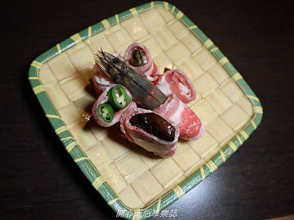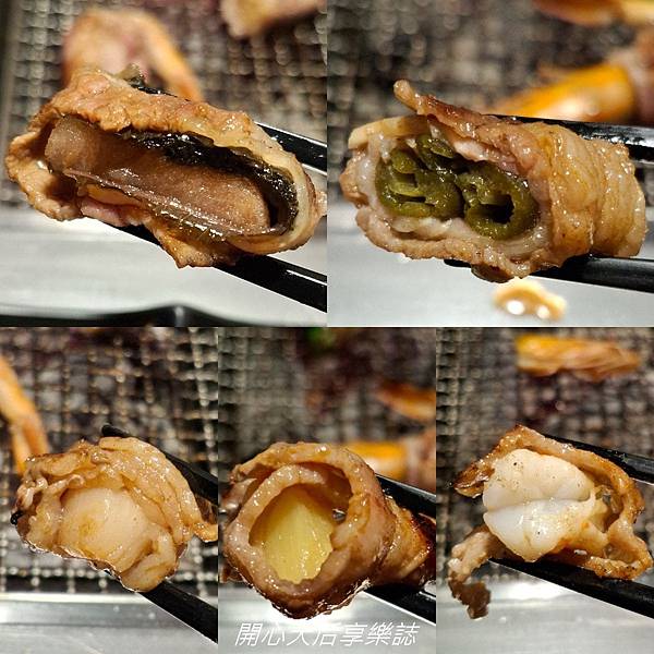 共有六捲:牛肉片包紫蘇蘋果、牛肉片包蝦(大/小蝦各1)、牛肉片包糯米椒、牛肉片包鳳梨、牛肉片包干貝