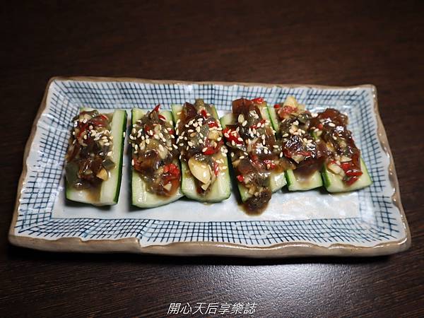 黑色幽默$80,外觀特別的開胃菜,小黃瓜上舖滿皮蛋、剝皮辣椒及特調醬料