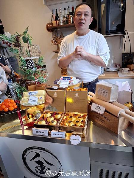 老闆親切詳細的介紹自家新品「金融家費南雪」、「金莎菠蘿蛋黃酥」特色: