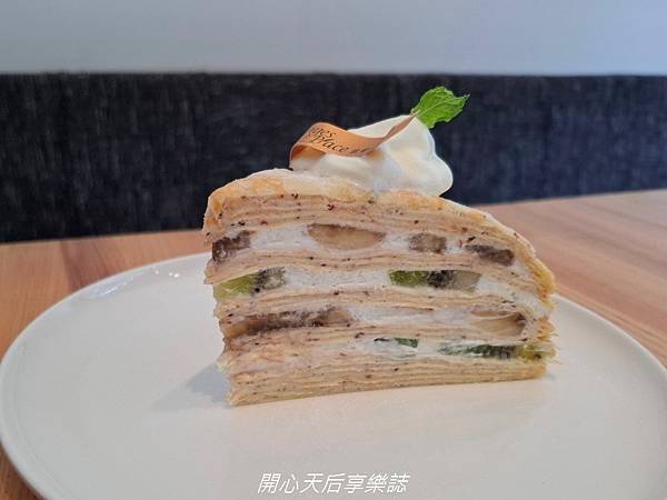 千層的薄餅皮層層堆疊,口感綿柔不失彈性,搭配溫潤的栗子栗子鮮奶油、酸甜的奇異果、香甜的香蕉、細膩柔滑微甜的奶油,甜美又清爽,帶給味覺多層次的驚喜!