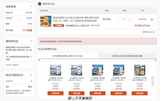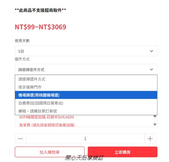 選擇【韓國飛譯通2.0WIFI機】頁面輸入天數,選擇取消方式