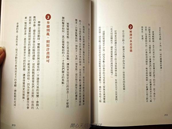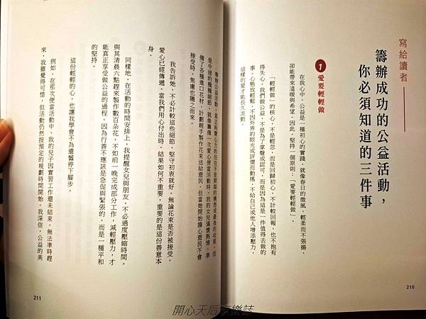 我很認同作者"寫給讀者"這章,推薦有心從事公益的人必看,因為唯有以正面心態無私的分享愛心,才不會"玻璃心",也才能有持續做公益的動力!