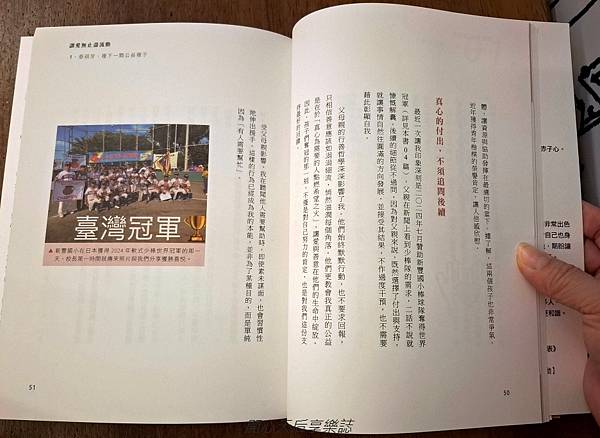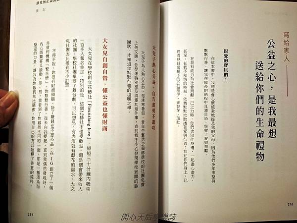作者從父母身上承襲行善的種子,這讓我很有共鳴~父母的身教往往比說教更有力量,就像書裡說的,捐血車一次次滿載而歸、設立獎學金幫助清寒學子、為身心障礙朋友添購復康巴士,這些看似龐大的公益,其實都源於「想讓世界更好」的單純初心!