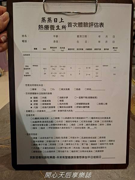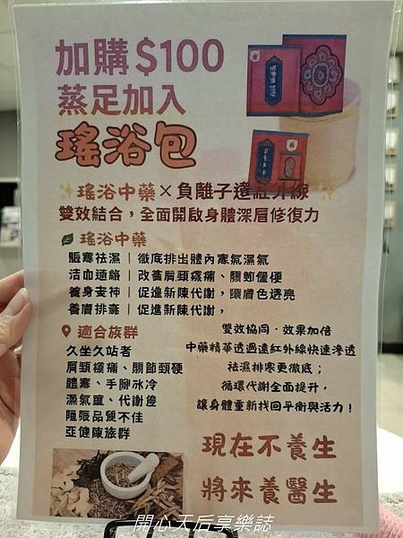 蒸蒸日上熱療養生所位置/環境介紹 【蒸蒸日上熱療養生所】位在八德監理站附近巷內,搭捷運到南京三民站或國父紀念館站,走路大約5~10分鐘即到,也有多路公車可到,交通方便! 一走進店裡,立刻感受到鬧中取靜的寧靜感,裝潢不是華麗的SPA會館,反而給人一種家的輕鬆自在 【蒸蒸日上熱療養生所】的服務項目不少,價位合理 我這次做能量礦石蒸足45分鐘+水牛角肩頸深層疏通20分鐘 流程:環境介紹/舒適更衣/足部清潔消毒/能量礦石遠紅外線負離子蒸足/水牛角肩頸深層疏通/養生茶+健康能量飲 先換店內準備的按摩衣 還用心準備藤籃,方便放置更換的衣服 填寫首次體驗評估表,並做蒸足前後的測量,好比較蒸足前後的差異 加100元讓雙足享受藥浴,更養生! 能量礦石蒸足桶上貼心準備好擦汗紙毛巾、手機架、水壺、日式手工艾草槌 預約時說出優惠碼:「0088」,就會得到一支手工艾草槌喔! 【蒸蒸日上熱療養生所】免費提供自製的能量飲 我選的藍莓飲,好美! 而且是放入不少藍莓現打的,含有穀物、優酪乳、蝶豆花凍等精心特調的植物性能量飲,口味微酸甜,好喝又飽足! 換上舒服的衣服後,老師引導我坐進特製的專利蒸足桶裏,桶內鑲嵌許多能量礦石,運用遠紅外線和負離子的熱能來蒸足,熱氣上蒸還能暖宮喔 我一邊喝能量飲、養生茶,一邊觀看能量礦石蒸足相關介紹影片,也不時用艾草槌敲打長期緊綳的肩膀,真是好享受~ 能量礦石蒸足,主要幫助循環+遠紅外線奈米霧化精華蒸氣滲透疏通 剛開始覺得雙足溫溫熱熱的,大約15分鐘後,感受到熱氣從足底往上竄,全身開始出汗了 蒸完45分鐘後,雙腿熱紅加大爆汗! 擦乾後,感覺雙腿發癢,老師立即拿蘆薈膠讓我擦上止癢 每個人蒸足後的反應不同,也各有不同的表徵 再看看我腳底和腿上排出的汗水顏色,也代表不同的身體狀況 蒸足後,感覺全身輕盈,一掃濕氣沉重感,全身也好暖和 接著老師使用真的水牛角搭配手技,針對我最卡的肩頸進行深層疏通 水牛角有特殊的活性溫感加上老師專業的手技,推開我長期頭、肩、頸的卡關,雖然過程中不免有痠、麻、痛感 但原本硬邦邦的砧板肩,變得柔軟許多,頭部也感覺輕鬆、清明多了 【蒸蒸日上熱療養生所】老師專業、親切、貼心,來這裏蒸足+肩頸疏通後,壓力全然釋放,心情輕鬆愉快,踩著輕盈的步伐回家~ 台北|蒸蒸日上熱療養生所 誼慧店長 電話:0955749426 / LINE:https://lin.ee/EoWrJv4 (預約時說出優惠碼:「0088」,就會得到一支手工艾草槌喔!) 電話:02-22331759/LINE:https://lin.ee/U4jEvTR (預約時說出優惠碼:「0088」,就會得到一支手工艾草槌喔!)